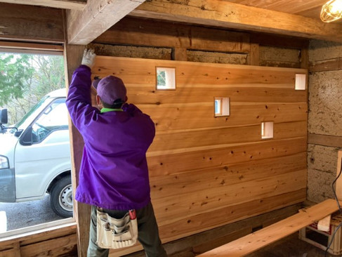 さらに、集落の方のご協力でDIY工房の内壁も土壁丸出しの状態から板張りのおしゃれな雰囲気になりました。その場その場でポツ窓の部分をくり抜くのですが、その精度が素晴らしく、職人の技術を見させていただきました。
