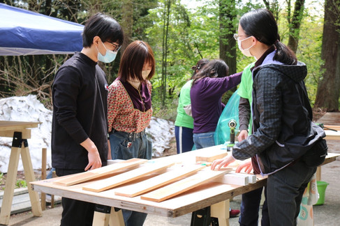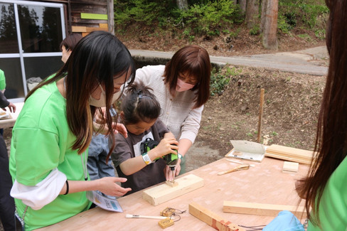D.I.Y.[Do It Yourself]を体験してもらうため、木材を塗るのに使ったはけもみんなで洗います!